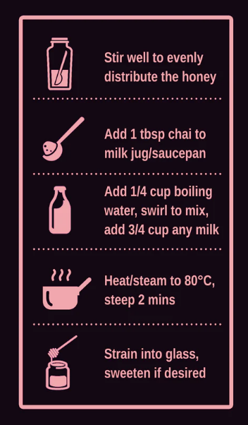 No syrups or powders here, just premium organic Assam black tea (TGFOP) and spices hand-blended with NZ bush honey and lashings of fresh ginger.