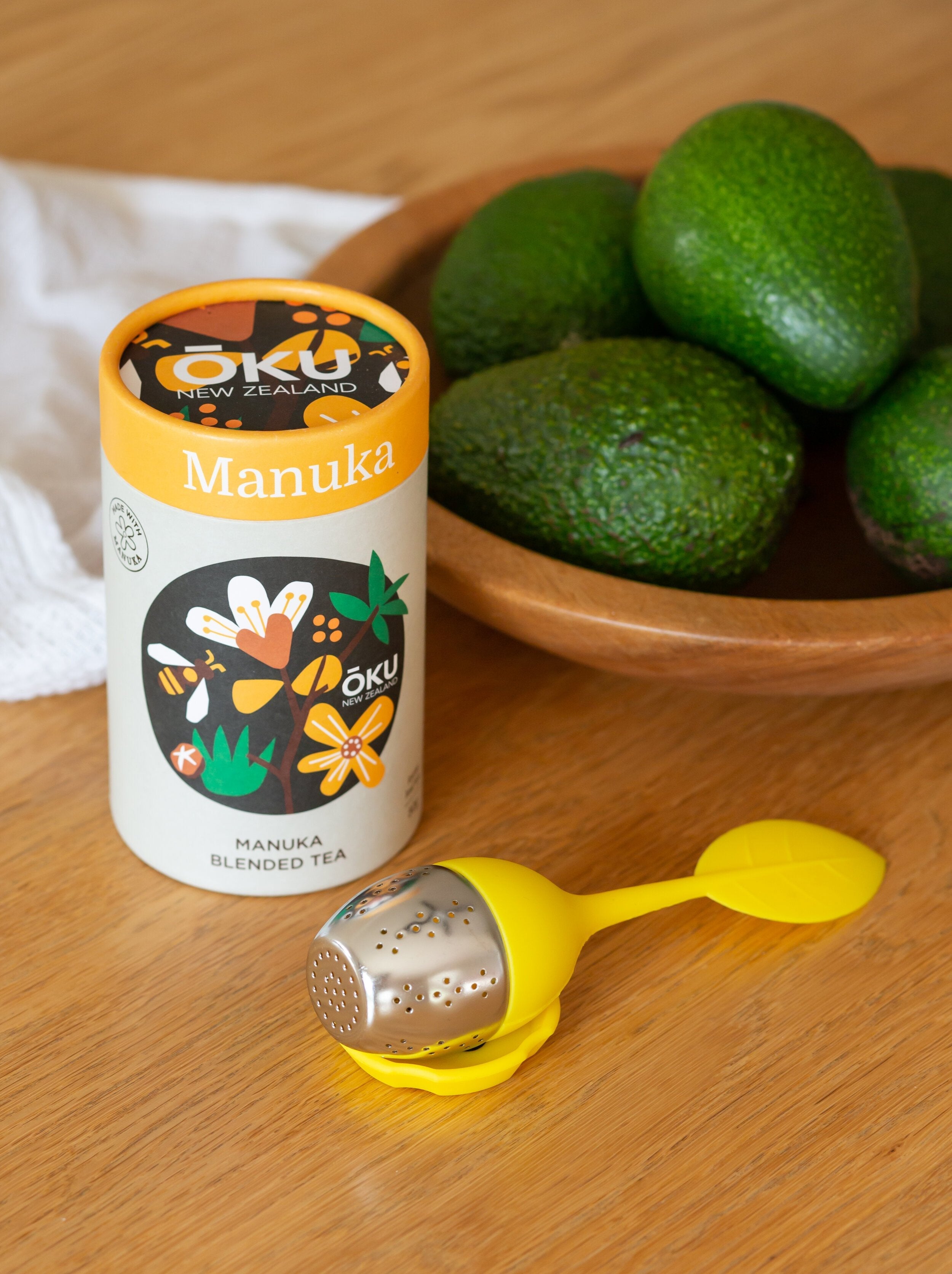 A colour matching silicon stainless steel leaf infuser with drip tray to go with your tube of ÅŒKU 30gm loose leaf tea.