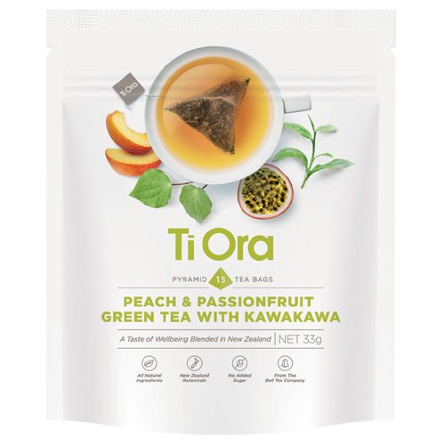 Ti Ora Green Tea Peach & Passionfruit is a delicate green tea blend, featuring the sweet and juicy flavours of peach and passionfruit, complemented by the subtle freshness of Kawakawa. Ingredients include green tea, apple, rosehip, hibiscus, licorice root, natural flavours, orange peel, fruit juice (peach, passionfruit, banana), and Kawakawa (2%).