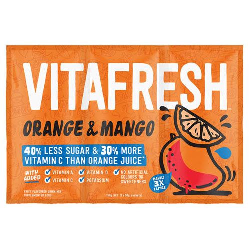 Vitafresh Orange & Mango is a classic, refreshing drink enjoyed for generations. This convenient powdered fruit drink delivers a tasty blend of orange and mango flavours while being packed with Vitamin C. Made with no artificial colours or sweeteners and containing less sugar than traditional orange juice, Vitafresh offers a healthier way to quench your thirst. Explore the wide range of flavours and enjoy satisfying hydration any time of the year.