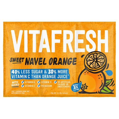 Enjoy a burst of refreshing flavour with Vitafresh Sweet Navel Orange. Vitafresh has been keeping people hydrated for decades and is a popular choice for those looking for a tasty drink option. Packed with Vitamin C, this powdered fruit drink contains no artificial colours or sweeteners and has less sugar than regular orange juice. With a range of flavours to choose from, it's a delicious way to quench your thirst any time of the year.